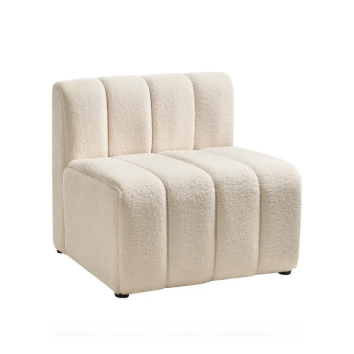 Šis modernus fotelis išsiskiria švelniu boucle audiniu ir plačia sėdima dalimi, suteikiančia itin daug komforto. Dėl minimalistinės formos ir neutralaus atspalvio jis lengvai įsilieja į skandinaviško ar modernaus stiliaus interjerą. Puikiai tinka jaukiam poilsiui ar akcentui svetainėje.