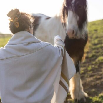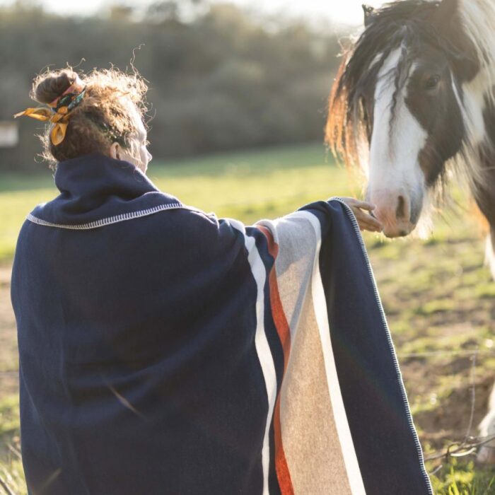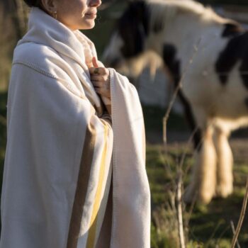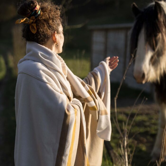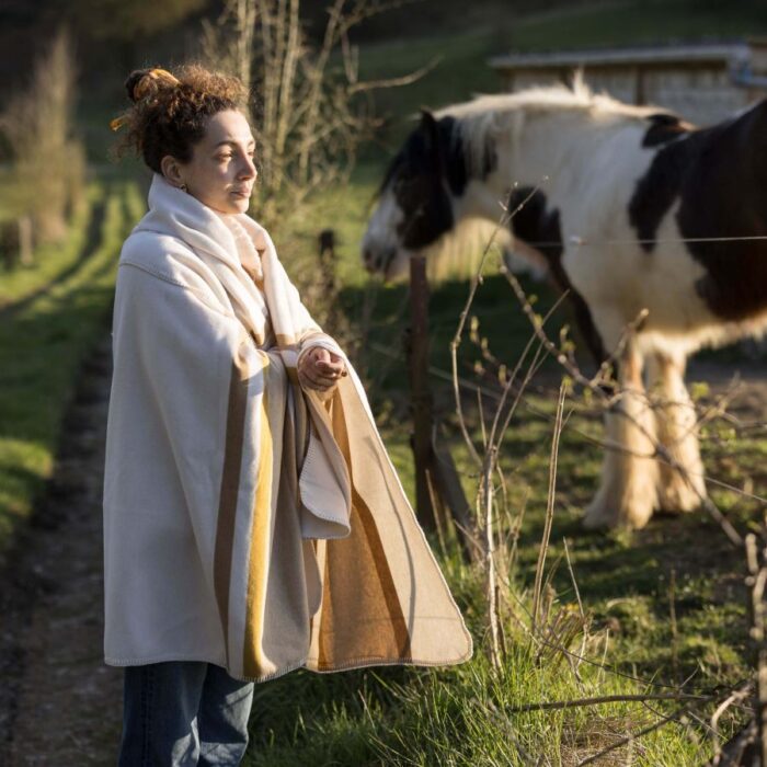 Jis spinduliuoja natūralia šiluma ir apgaubia švelniu minkštumu, kviečiančiu atsipalaiduoti. Kraštus puošia rankų darbo tipo dygsniuota apdaila su kontrastiniu apsiuvimu, subtiliai išryškinančiu užtiesalo formas. Šis tradicinis siuvinėjimas atspindi europietišką meistrystę ir suteikia autentiškumo – detalę, kuri kuria išskirtinumą.