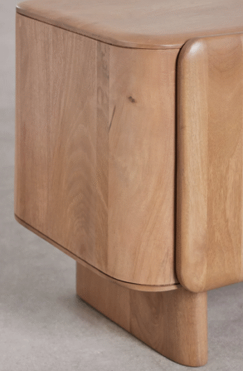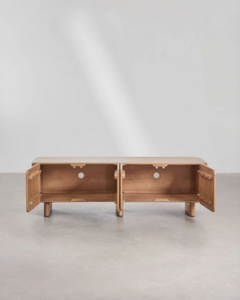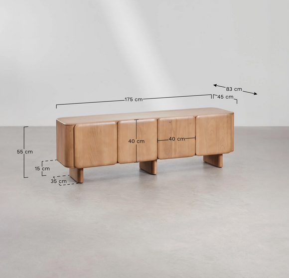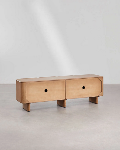 TV spintelė iš mango medienos – elegantiškas ir tvirtas baldas, įkvėptas modernios estetikos. Švelniai suapvalintos formos, pusiau matinis paviršius ir natūrali medienos tekstūra sukuria jaukų, šiltą įspūdį. Patogūs laidų praėjimai slepia techninius elementus, o „soft close“ sistema garantuoja tylų durų uždarymą. Tai ne tik televizoriaus baldas, bet ir stiliaus pareiškimas jūsų svetainėje.
